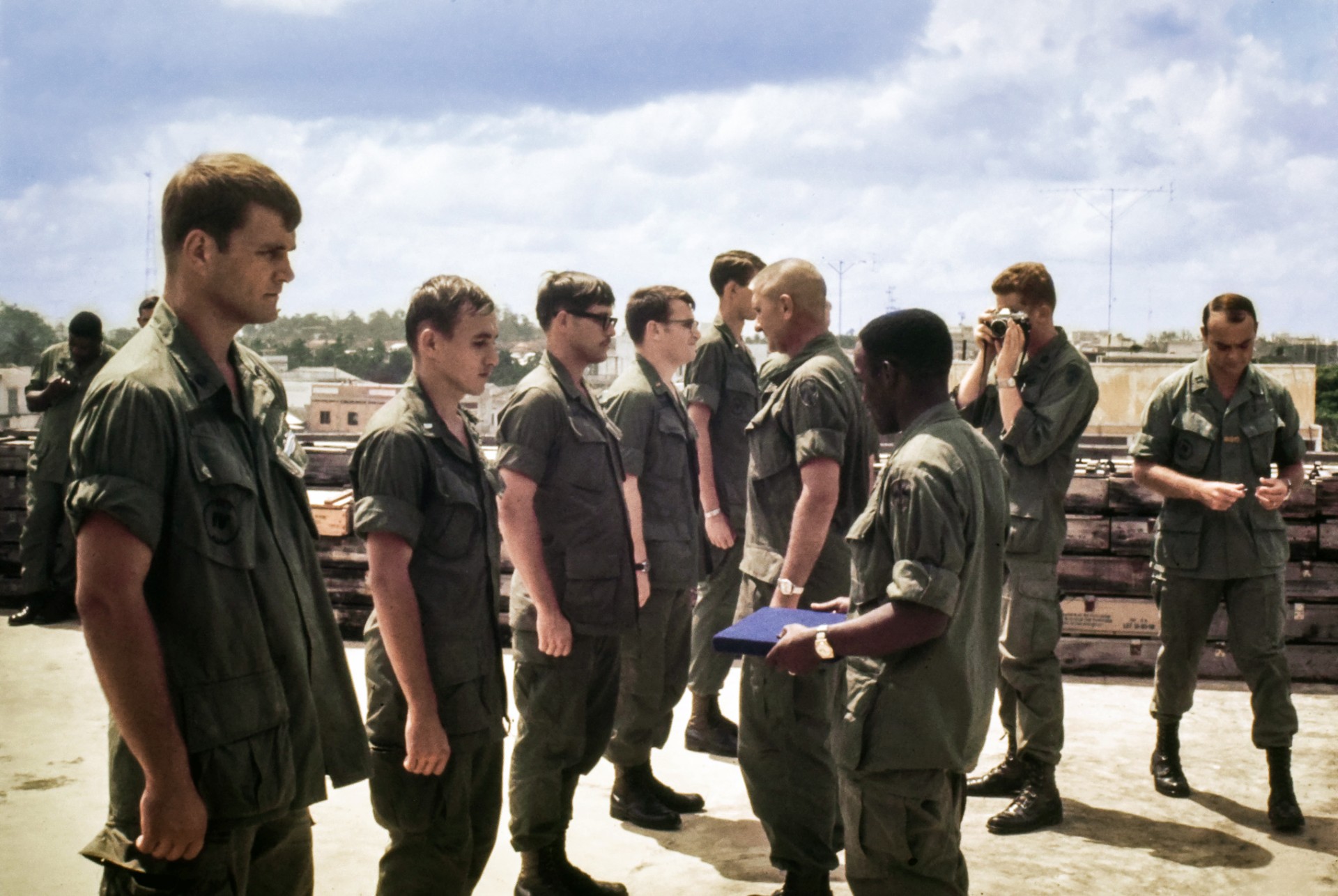 Mike Latimer, Eugene Godfrey, and Ed Lukey being promoted to 1st LT. Vietnam, Phong Dien Province, Adv Tm 56.